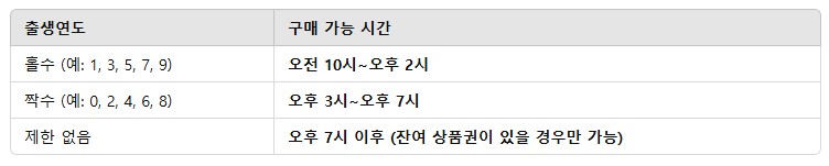 - 오후 7시 이후에는 출생연도와 관계없이 잔여 상품권이 있을 경우 구매 가능