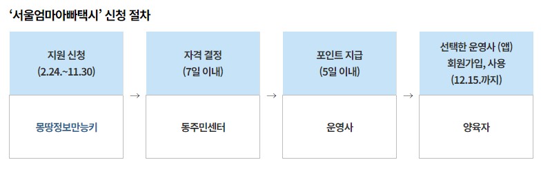 서울엄마아빠택시는 2025년 2월 24일부터 ‘몽땅정보만능키’에서 신청할 수 있습니다. 신청 대상은 서울시에 거주하는 24개월 이하 영아 양육 가정이며, 엄마·아빠뿐만 아니라 실질적인 양육자도 신청할 수 있습니다. 올해부터는 위탁가정도 신청이 가능합니다.