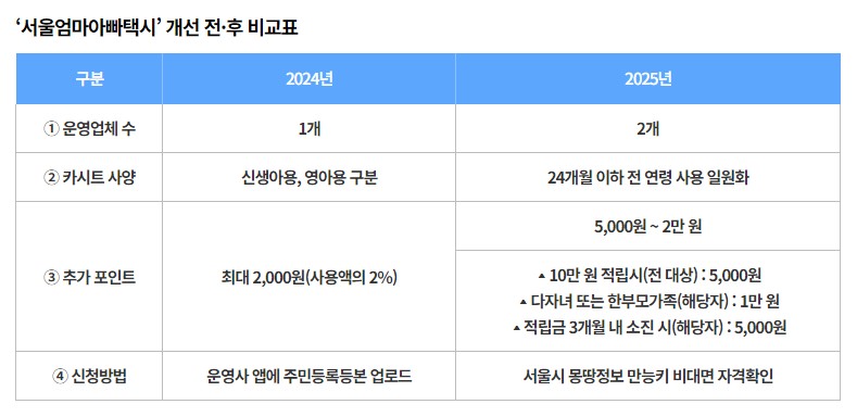 2024년부터 ‘서울엄마아빠택시’는 아래와 같은 네 가지 주요 개선 사항을 통해 한층 업그레이드되었습니다.