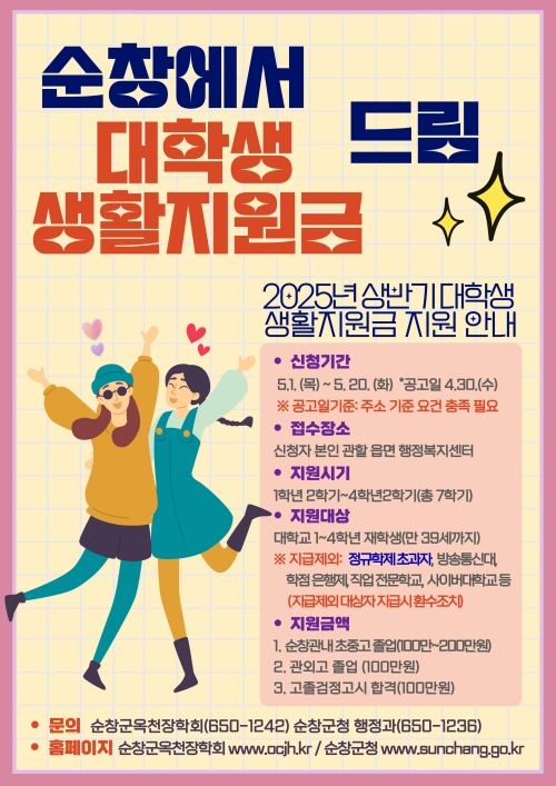 전북 순창군이 지역 대학생들의 생활비 부담을 덜어주기 위해 최대 200만 원을 지원하는 ‘2025년 대학생 생활지원금 지원사업’을 본격 시행합니다.