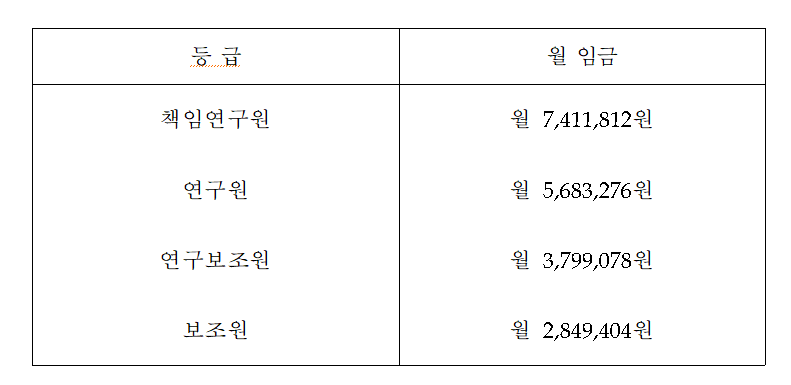 - 연구비 집행 규정에 따라 각 연구원의 등급별 지급 기준이 다를 수 있습니다.