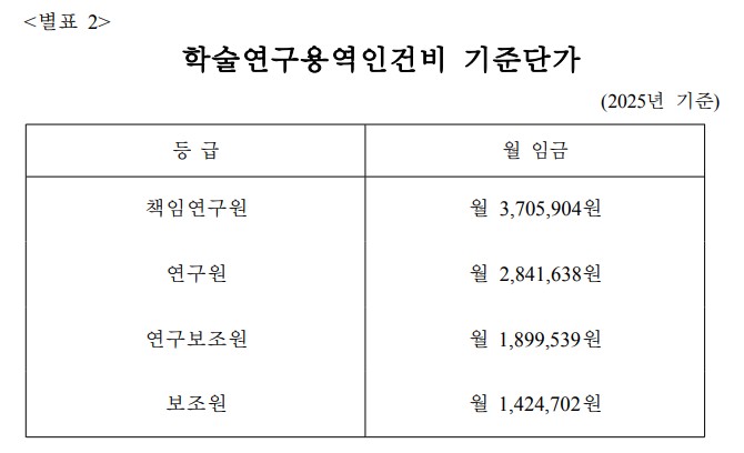행정안전부에서 2025년 1월 2일 목요일 발표한 2025년 학술연구용역 인건비 기준 단가 공유해 드립니다.