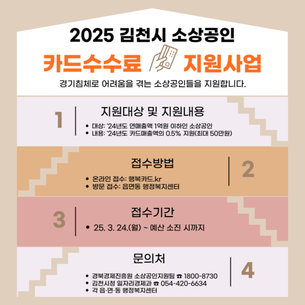 이에 김천시는 소상공인의 경영 부담을 줄이기 위해 카드수수료 지원사업을 추진하며, 일정 비율을 보전해 주는 방식으로 소상공인의 실질적인 수익 증가를 돕고 있습니다.